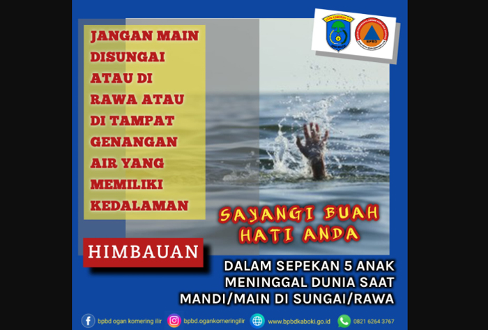 OGAN KOMERING ILIR, BERITAANDALAS.COM – Badan Penanggulangan Bencana Daerah (BPBD) Kabupaten Ogan Komering Ilir (OKI) mengimbau para orang tua yang bermukim disekitar sungai agar lebih waspada terhadap anak-anak mereka saat bermain diluar rumah.