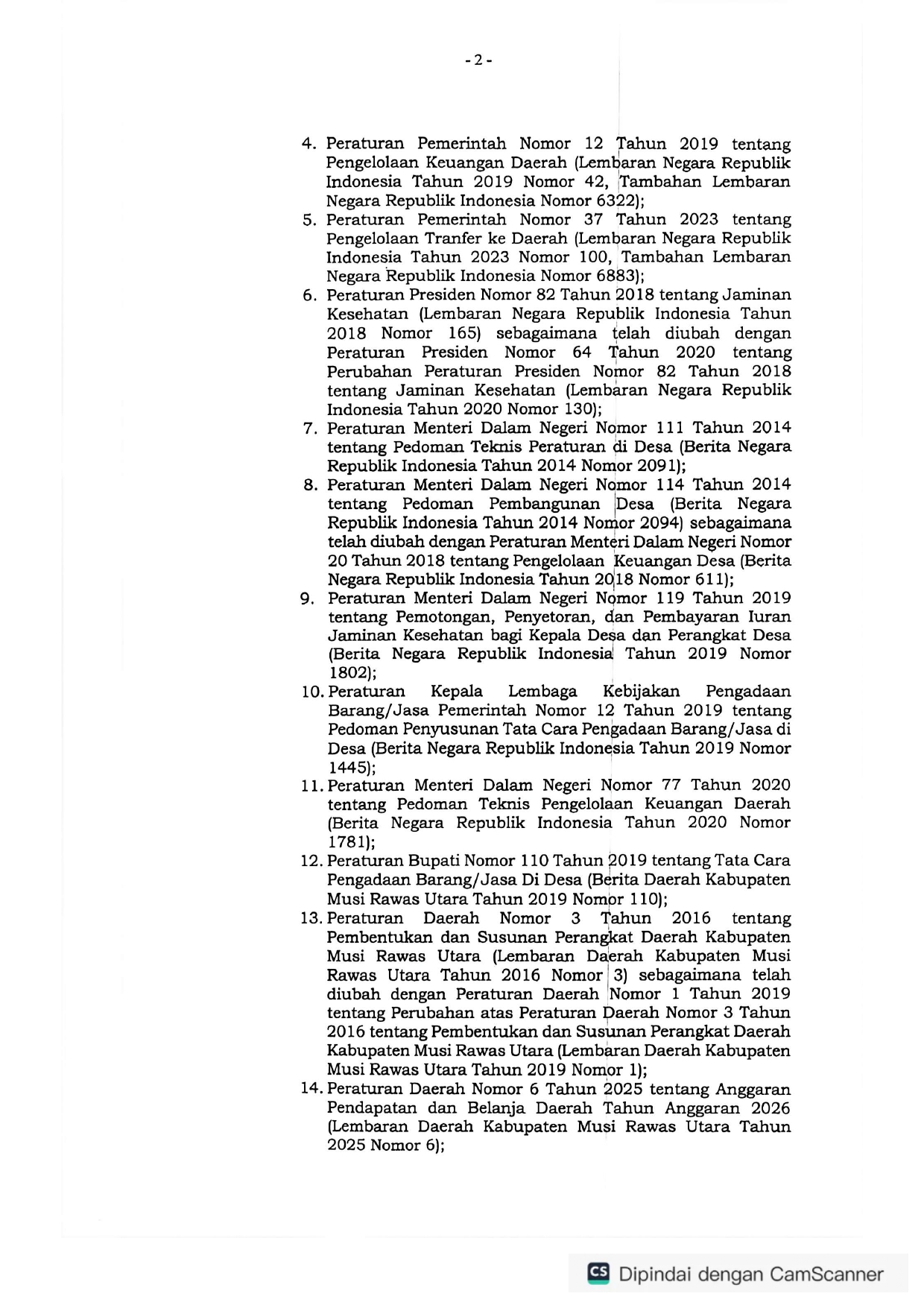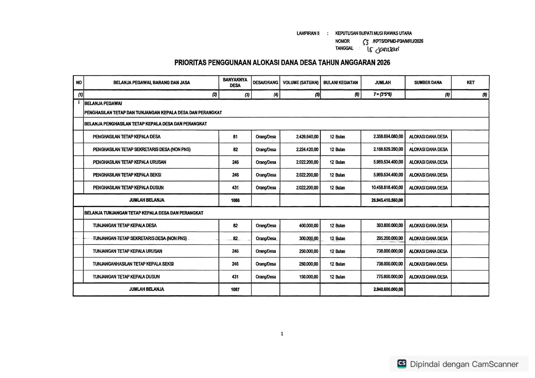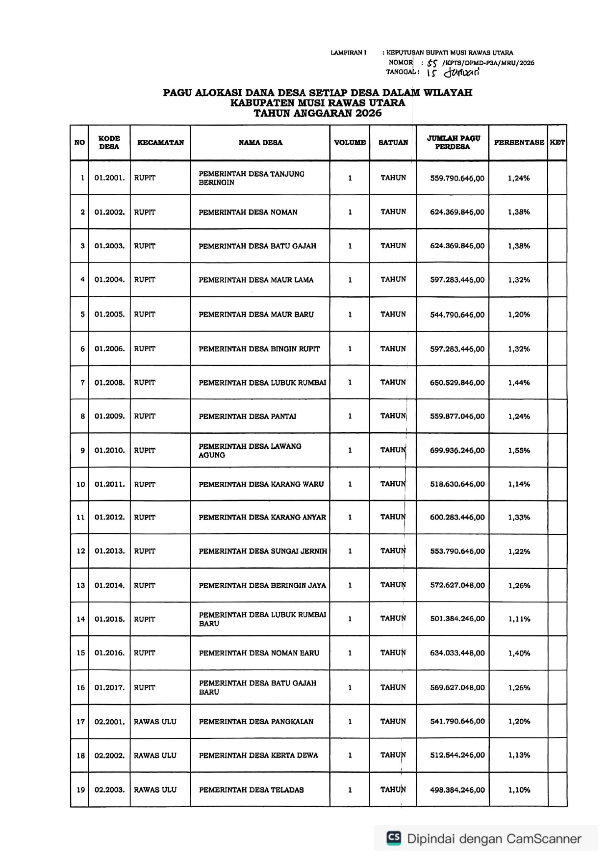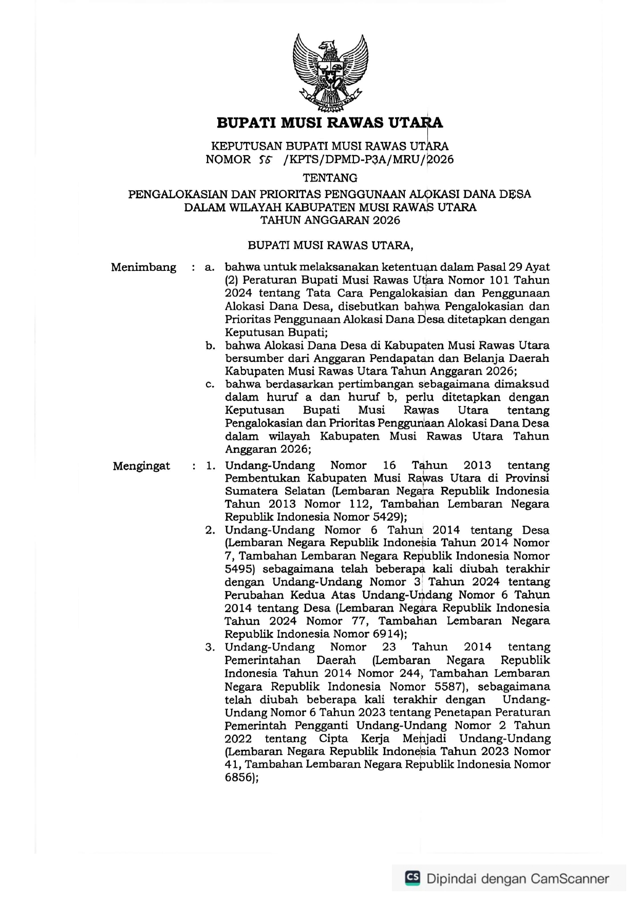 Adapun tiga SK yang ditetapkan meliputi SK tentang pagu Alokasi Dana Desa (ADD) tahun anggaran 2026, SK tentang standar biaya umum desa tahun anggaran 2026, serta SK tentang pedoman penyusunan Anggaran Pendapatan dan Belanja Desa (APBDes) tahun anggaran 2026. Ketiganya menjadi pedoman wajib bagi seluruh pemerintah desa di wilayah Kabupaten Musi Rawas Utara.
