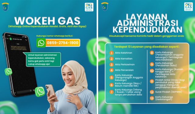 OGAN KOMERING ILIR, BERITAANDALAS.COM – Layanan administrasi kependudukan kini hadir dengan terobosan baru yang semakin memudahkan masyarakat. Dinas Kependudukan dan Pencatatan Sipil (Disdukcapil) Kabupaten Ogan Komering Ilir (OKI) meluncurkan inovasi layanan berbasis digital bertajuk WOKEH GAS, singkatan dari WhatsApp Online Kependudukan Handal, Gratis, Aktif dan Sigap. Melalui layanan ini, warga tidak lagi harus datang langsung ke kantor untuk mengurus berbagai dokumen penting.