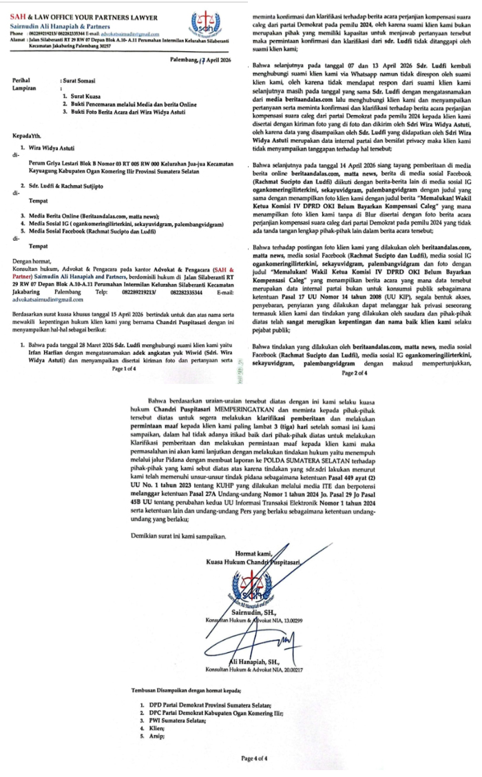 Somasi tersebut berkaitan dengan pemberitaan yang tayang pada Selasa (14/4/2026). Dalam pemberitaan itu, nama Chandri Puspitasari yang menjabat sebagai Wakil Ketua Komisi IV DPRD Kabupaten Ogan Komering Ilir (OKI) dari Fraksi Demokrat memang tengah menjadi sorotan publik. Hal ini mencuat setelah beredarnya dokumen berita acara perjanjian kompensasi suara caleg Pemilu 2024 yang disebut-sebut belum direalisasikan.