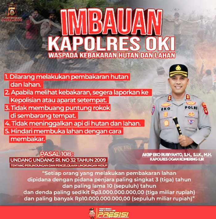 Polres OKI telah menyebarkan poster imbauan yang disesuaikan untuk media sosial, berisi lima larangan utama terkait aktivitas di lahan dan hutan. Poster ini juga merujuk pada Undang-Undang RI Nomor 32 Tahun 2009 tentang perlindungan dan pengelolaan lingkungan hidup.