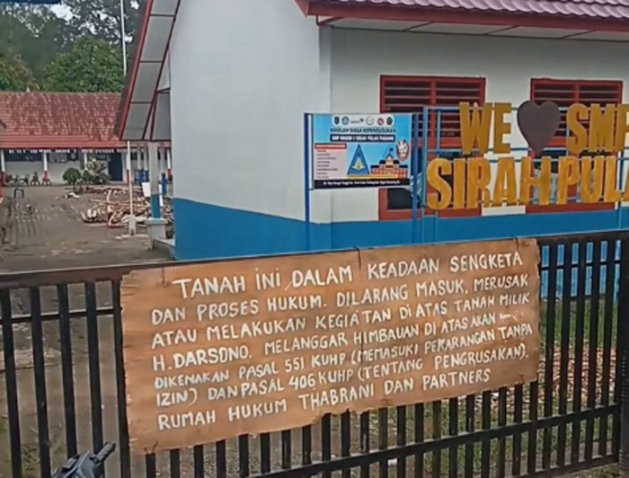 Di depan pagar sekolah, tampak terpasang papan pemberitahuan bertuliskan ‘tanah ini dalam keadaan sengketa dan proses hukum. Dilarang masuk, merusak, atau melakukan kegiatan di atas tanah milik H. Darsono. Melanggar himbauan ini akan dikenakan pasal 551 KUHP (memasuki pekarangan tanpa izin) dan pasal 406 KUHP (tentang pengrusakan). Rumah Hukum Thabrani dan Partners’.