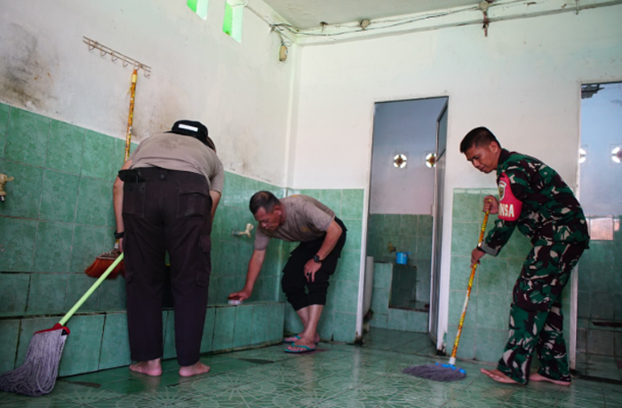 Sejumlah personel kepolisian tampak membersihkan bagian dalam hingga halaman masjid. Lantai disapu dan dipel, perlengkapan ibadah dirapikan, sementara area sekitar turut dibersihkan. Kegiatan berlangsung dalam suasana gotong royong, menciptakan interaksi yang hangat antara aparat kepolisian dan masyarakat.