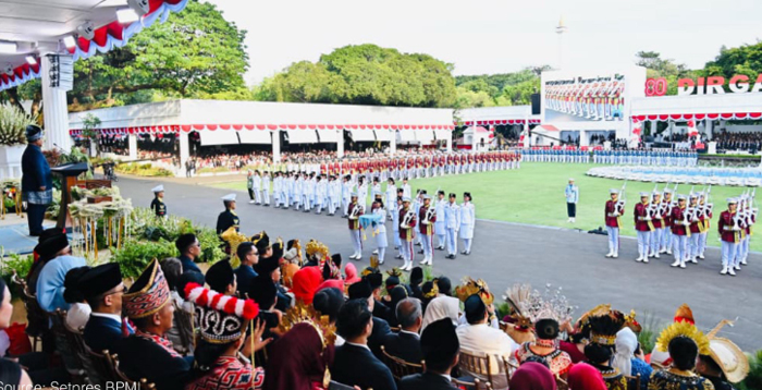 Prosesi berlangsung khidmat dengan pengibaran sang saka merah putih, pembacaan teks Proklamasi, hingga penampilan seni budaya dari berbagai daerah.