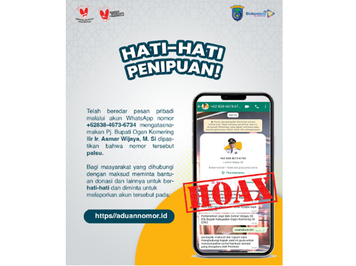 “Bahwa kemarin ada masyarakat menerima pesan WA yang mengatasnamakan Pj. Bupati OKI Asmar Wijaya. Kami sampaikan bahwa nomor tersebut palsu,” tegas Plt. Kadis Kominfo OKI Adi Yanto, Selasa (9/4/2024).