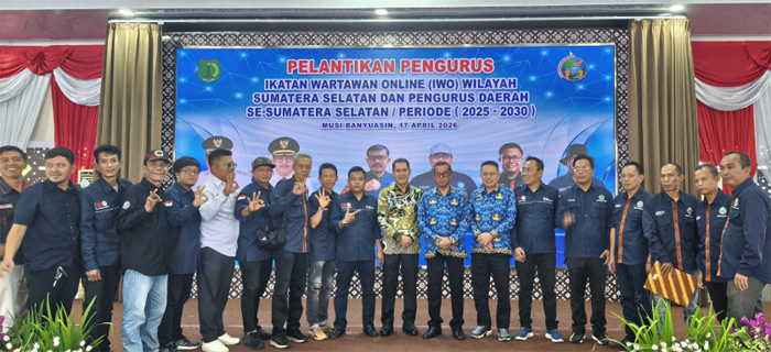 MUSI BANYUASIN, BERITAANDALAS.COM – Pelantikan Pengurus Daerah Ikatan Wartawan Online (IWO) se-Sumatera Selatan berlangsung khidmat dan serentak di Kabupaten Musi Banyuasin (Muba), Jumat (17/4/2026).