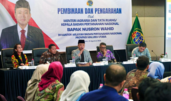 MALUKU UTARA, BERITAANDALAS.COM – Menteri Agraria dan Tata Ruang/Kepala Badan Pertanahan Nasional (ATR/BPN), Nusron Wahid, memberikan pembinaan kepada jajaran Kantor Wilayah (Kanwil) BPN Provinsi Maluku Utara di Kota Ternate, Sabtu (23/8/2025).