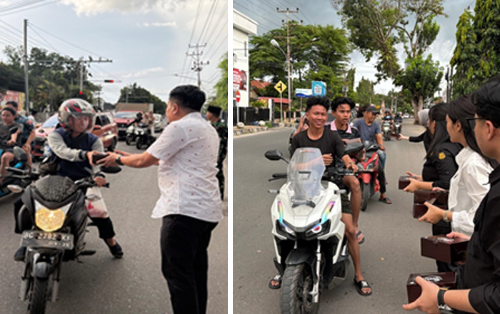 Para personel Kejaksaan tampak turun langsung ke jalan untuk membagikan paket berbuka puasa secara tertib. Kegiatan ini disambut antusias oleh masyarakat yang melintas dan menjadi momen kebersamaan yang penuh kehangatan.