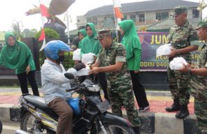 OKI - Ratusan nasi kotak dibagikan Dandim dan anggota Kodim 0402/OKI kepada masyarakat pengguna sepeda motor, pemulung, tukang becak dan tukang ojek yang melintas...