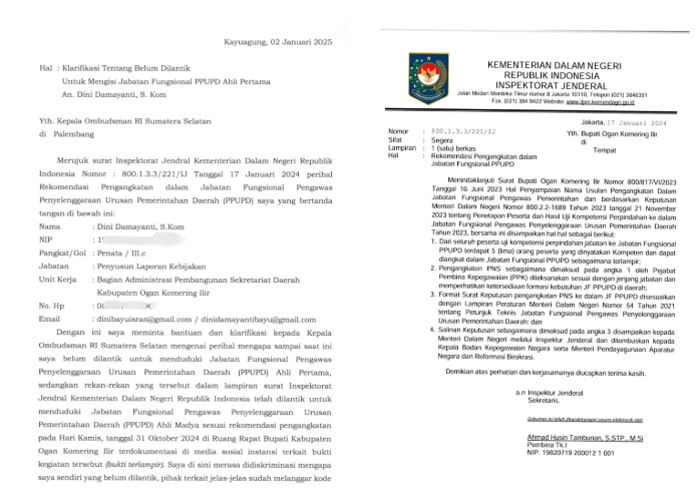 Dini juga mengungkapkan pengalaman serupa pada 2022, ketika permohonan mutasinya ke Inspektorat Kabupaten OKI ditolak tanpa penjelasan resmi, meskipun semua dokumen telah dilengkapi. Jabatan yang dilamar justru diberikan kepada ASN lain.